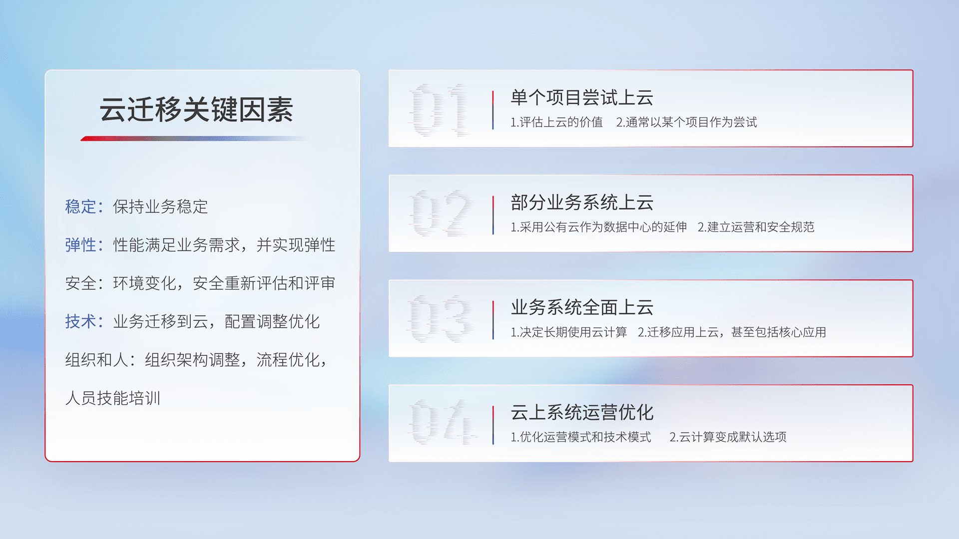 结合实际业务,,,从规划设计、、、云平台选型、、、、云原生改造、、数据迁移、、、、集成交付,,,,迁移全过程为客户识别最佳上云路径,,,做好风险识别管理,,设计网络架构、、、身份权限、、安全审计合规、、、操作审计、、、、日志审计、、监控告警策略、、、多站点容灾设计等,,对云上基础设施进行整体规划,,提升IT治理水平,,,以满足弹性、、高可用、、高性能的需求。。。