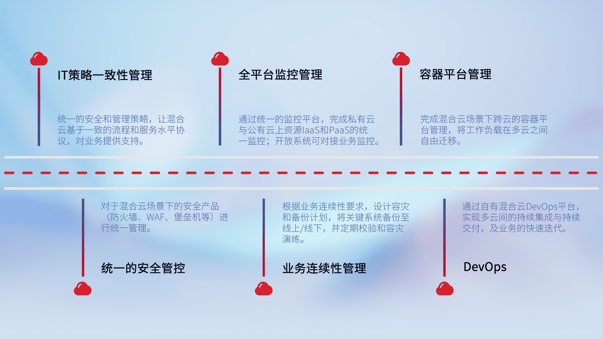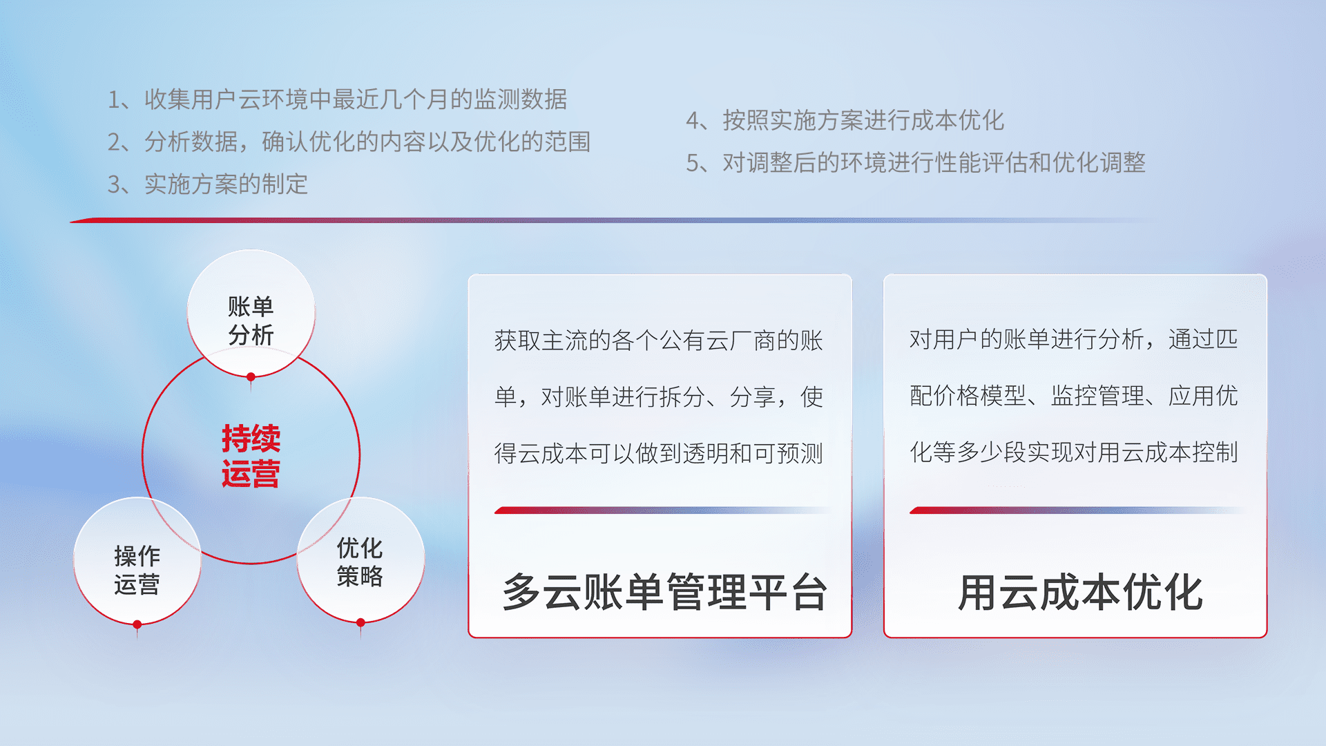通过多云纳管,,,,以统一的资源数据模型把客户的云资源进行抽象和封装,,,进而实现对多云资源的统一操作,,保障云资源管理的可靠性、、、稳定性与可用性。。。。量身定制化运维内容,,配置、、开发运维、、、补丁管理、、备份、、、、监控、、、、认证和访问管理、、、、审计和日常巡检等,,保障在用云过程中的可靠度,,,稳定度以及高可用率。。。