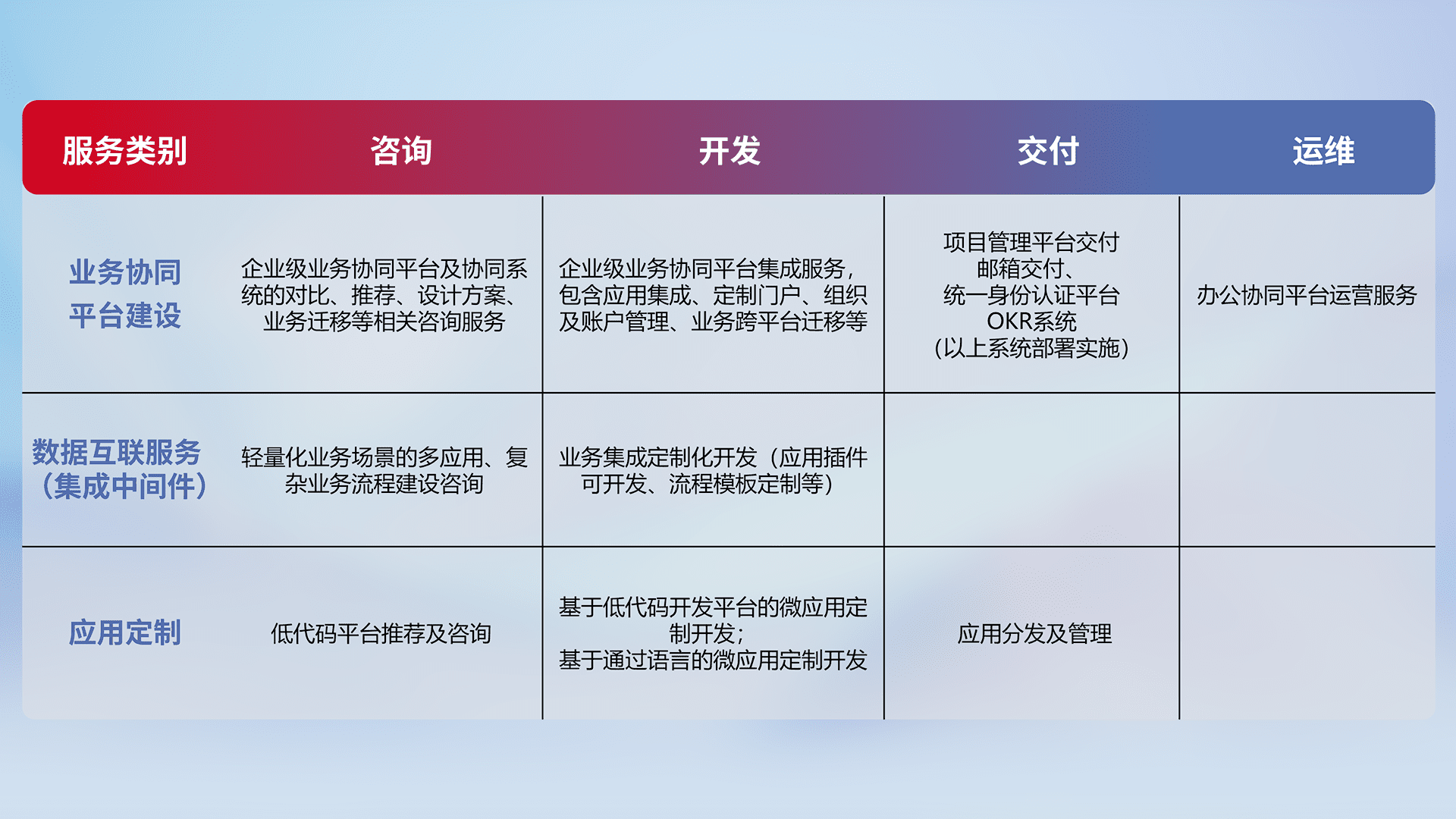 针对钉钉、、、企微、、IDaas等平台级产品提供产品的规划、、、、方案、、、、交付、、定制化开发等服务,,实现如统一协同办公、、、智能客户服务、、、、混合会议管理、、、智能数据查询、、等业务场景,,,实现数字化转型。。。